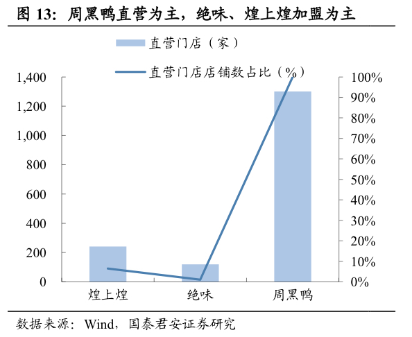 从产品包装来看,不同于其他两家的散装为主,周黑鸭基于食品安全考量,采取的是锁鲜装的包装方式。锁鲜装的缺点显而易见,固定的重量降低了顾客的购买灵活性,且锁鲜装的价格明显高于散装。以三家招牌鸭脖为例,根据数据显示,绝味、煌上煌的客单价为25—35元每单,而周黑鸭的客单价则达到了40—60元每单。不仅如此,定位高端的周黑鸭在产品定价方面,也明显高于其他两家。日常价32元/250克的价格是绝味和煌上煌39.8元/500克的1.6倍左右。一方面,盒装售卖方式对于单个散客来说,可选的产品种类有限,限制了消费者对于消费数量的选择;另一方面,高价定位也对消费者的人均消费量产生了一定的抑制作用。从这两方面可以看出,周黑鸭高端策略的打法不仅没有为品牌带来更大的竞争力,反而使公司陷入了空有名气,没有销量的窘境。再从门店布局来看,周黑鸭的前期店面选址多以高铁、机场、综合购物超市等地区为主,基本符合公司礼赠/高档休闲卤味的品牌调性。但是,高铁、购物超市等地段租金高、竞争激烈,公司在人力资源、管理成本和产品运输等方面都面临着较大压力。渠道铺设上,在2019年之前,周黑鸭一直以直营模式为主,直营门店数量占到了总门店数量的90%以上。2018年,周黑鸭自营店收入占比86.5%,线上渠道占比9.4%,分销商及其他渠道合计占比4.1%。这意味着,公司的经营情况基本完全依赖于直营门店。图:绝味、煌上煌、周黑鸭三家直营店门店数量、占比比较(来源:wind,国泰君安证券研究)尽管直营模式的利润率水平明显高于加盟模式,在产品品控把握,门店标准统一上也具有一定优势,但直营的模式也限制了公司规模的铺开。相较于加盟模式,直营店属于重资产模式,对于公司的资金、人力要求高,在扩张速度上远不及加盟模式。截止2020年,周黑鸭的总门店数为1755家,而同一时期的煌上煌,门店数量已经达到了4627家,是周黑鸭的两倍之多。且从16年开始,周黑鸭的门店扩张呈现出疲软态势,门店的扩张速度也在不断下降。门店的扩张是对消费者心智抢占的第一步,品牌在全国扩展的范围越大,品牌的知名度也就越高,消费者对于同品类产品选择的优先级也就越前。目前,周黑鸭的门店分布主要集中于一二线城市,覆盖城市数仅121个,相较于绝味的338个和煌上煌的220个,周黑鸭仍有很大的下沉空间。受制于高端品牌的定位,周黑鸭依靠品质无法满足消费者对于物美价廉产品的期待,而自视清高的直营门店模式,限制了门店开拓和市场下沉,由此造成的规模上的差距也是导致周黑鸭业绩持续下滑和行业地位退步的主要原因。想靠“高端”定位打出差异化的周黑鸭,实际是陷入了自己设置的逻辑陷阱之中。周黑鸭不是没有意识到存在的问题,其实从2019年公司开放特许经营加盟权开始,就已经可以看出周黑鸭在放低自己的姿态,只是似乎并没有取得理想的效果。