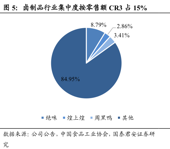 与业绩同步下滑的还有周黑鸭的总销量和采购单价。数据显示,2020年周黑鸭总销量2.58万吨,同比2019年的3.59万吨下滑28.13%;且周黑鸭每张采购订单的平均消费额从2019年的62.18元,下降到60.67元,同比下滑2.43%。对于2020年周黑鸭经营表现不佳的原因,财报中将原因完全归结于新冠疫情致使门店客流锐减,销售额下降。可事实真的如此吗?诚然,门店总部位于武汉的周黑鸭受到疫情冲击影响大,业绩出现较大下滑情有可原,但不可回避的是,早在2020年营收下滑、数据惨淡之前,周黑鸭已经连续两年出现业绩下跌,对于这种情况,公司又该如何解释?在新眸看来,周黑鸭营收利润的下跌其实早有预见。定位于高端休闲的周黑鸭在定价、口味、包装、消费场景、营销策略等多个方面彰显着与其他两家巨头的不同。而正是这种定位,局限着周黑鸭的发展空间,让周黑鸭在获客和门店开设方面都显得束手束脚。对于此种结论的得出,笔者将在后文进行详细论述。因此,正如我们看到的,成立时间早周黑鸭六年的煌上煌,在周黑鸭成立的前几年一直被压着风头,但自2017年以来,两家的营收差距不断缩小,到了2020年,煌上煌更是在营收和净利润方面都实现了反超,成功从“三弟”晋升为“二哥”。此外,对于周黑鸭来说,竞争者绝不仅仅是“大哥”绝味和新晋“二哥”煌上煌。数据显示,2019年卤制品行业市场份额占比中绝味、煌上煌、周黑鸭三家仅占到了整个市场的15%左右,尤其是周黑鸭和煌上煌两家的市场份额加起来也才占到6%左右。这也就意味着,从剩余85%的市场中再跑出一两个巨头来,并不是没有可能。向前争不过其他两家巨头,向后还要随时面临着其他品牌的突围,周黑鸭正身陷困境。不同于绝味定位休闲、煌上煌定位餐桌,周黑鸭的初始定位是高端休闲,从后面发展来看,也正是因为“高端”,限制了周黑鸭。
