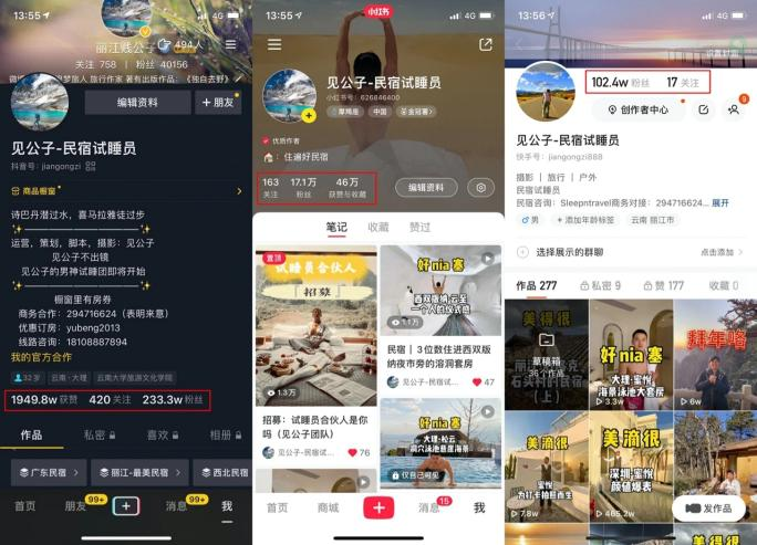 例如快手平台主播见公子,作为近几年才兴起的民俗酒店试睡员,足迹遍布丽江、大理、广西、西双版纳等热门旅游城市,通过视频的方式记录试睡体验,在快手平台累积100w+粉丝。