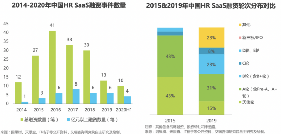 这一点,从国内HR SaaS的投融资情况也可得知。根据艾瑞咨询数据统计,自2014年至2020年上半年,中国HR SaaS领域共有198笔融资事件,融资事件数量在2016年达到峰值后逐渐回落,从融资轮次的分布来看,A轮及以前的融资笔数占比由2015的92.6%下降至2018年的46%,2020年上半年B轮及以后的融资比例超过一半。