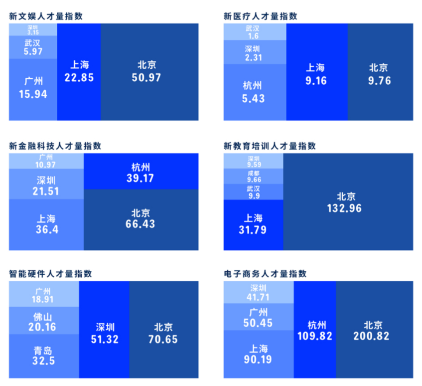 离开北京的人,更多的去了天津;上海的去了苏州;广州的去了佛山;深圳的去了东莞。相较于北上广深,新一线城市在享受一线城市带来的经济辐射的同时拥有更小的竞争压力和交通住房压力。值得一提的是,在北上广深人才流向的TOP5中,重庆、长沙都占有一席之地,这也意味着,中部城市对人才的吸引力在增强,东部城市独霸年轻人的局面正在瓦解。但需要说明的是,年轻人选择逃离北上广深,并非一种逃避,而是一种明智的选择。依托产业积累和区位优势,新一线城市和二线城市在新经济发展领域反超一线城市:合肥在人工智能领域人才量级领先深圳;武汉成都在教育培训领域崛起;青岛佛山依靠原有家电制造优势,在智能家电领域独树一帜。 图:新经济领域人才分布热点城市(来源:脉脉研究院)