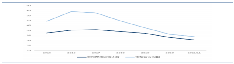 当市场焦点还滞于拼多多、阿里巴巴、苏宁等电商巨头争夺战时,京东旗下的京东物流、京东健康已先后完成IPO,京东数科虽因特殊原因终止IPO,但其底牌依然健在。有人说“拆分上市”是为了把鸡蛋装进不同的篮子,利于分散风险,也有人说,企业拆分利于旗下高增长业务获得更高的估值。从某种意义上来说,京东是互联网届业务拆分的“行家”。2019年成立的京东健康,同年5月完成10亿美元A轮融资后,从京东集团拆分独立运营,次年8月获高瓴资本超8.3亿元B轮融资,并于同年年底赴港上市;成立于2012年的京东物流,虽动作稍慢,也于今年5月赴港上市,挂牌首日,超额认购714.61倍,国际发售超额认购9.8倍。在既有集团业务基础上,合并、拆分出新业务、推向资本市场几乎是所有互联网大厂的基调,我们所好奇的是,为何京东这套打法看似简单却最为稳固,其依赖的核心逻辑又是什么?为此,本文新眸将围绕京东的业务孵化展开分析。众所周知,彼时国内的网络购物还是个新物种,产业链条还不完善,独立电商平台很难完成整个销售过程,这也是京东物流、京东数科的成立逻辑。我们先来讲一下京东物流,其核心初衷是服务于京东商城,自2012年起,即便京东集团SKU数量激增,但在京东物流“帮忙”下,京东集团仍将存货周转天数稳定在40天以下。根据华创证券研究,2020年京东集团通过京东物流网络处理的在线订单总数中,约90%可于下单当日或次日送达,作为对内服务的战略布局之一,京东物流的高效履约成为京东商城的竞争优势之一。图:京东商城存货周转天数(来源:公司公告,华创证券)