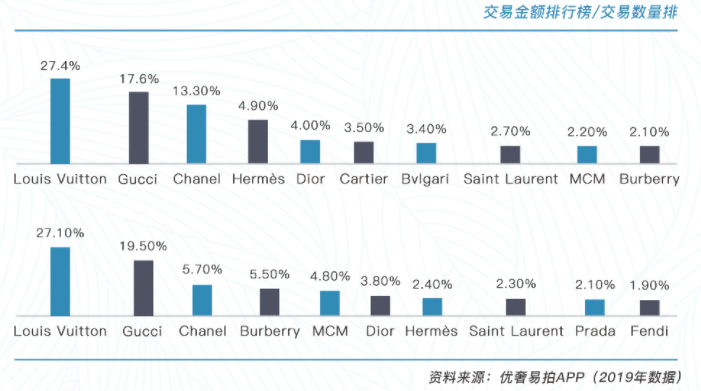 图:2019年奢侈品交易数量和交易金额排行榜(来源:优奢易拍APP)