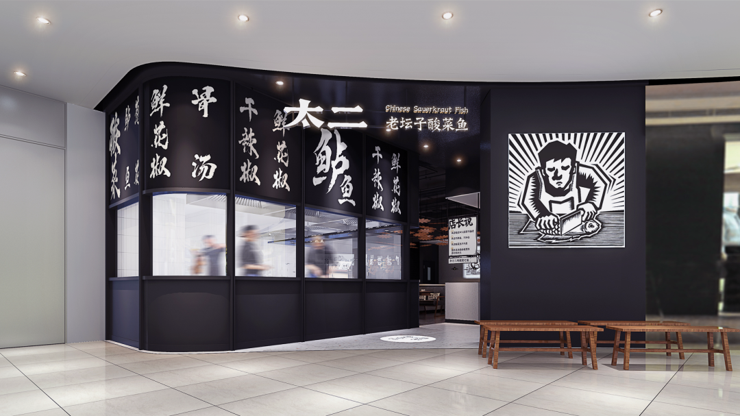 无论是太二酸菜鱼的核心IP形象,还是它的门店装修,均采用了统一的黑白日漫画风,二次元风格明显。门店装饰的一些文字,就像是日漫中的热血台词,创造了很强的记忆效果,同时也有着很高的可复制性,天南海北的食客走进太二酸菜鱼门店时,都彷佛进入了一个相同的场域,让人忘却现实生活三次元的烦恼。