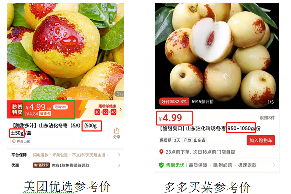 打开应用,标红标粗的价格直接映入消费者眼帘,所谓的低价策略也可能是商家在“玩花样”,以山东沾化大枣为例,在美团优选和多多买菜上定价相同,均为4.99元/份,消费者通常会默认两者同价、同量,殊不知商品重量同样是需要关注的重点。