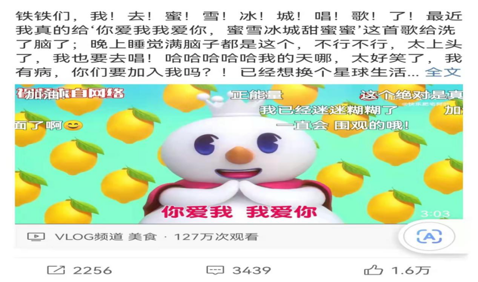 以去最出圈的蜜雪冰城魔性MV为例,一经发布,微博上#这是蜜雪冰城新歌吗#话题就冲上热搜第一,相关话题阅读量超6亿,还衍生出相关蜜雪冰城表情包,甚至还有一些网友翻出了蜜雪冰城此前对IP形象雪王的情景设定,一时间,大量用户开始竞相玩起了梗,无形间给蜜雪冰城造了一波势。