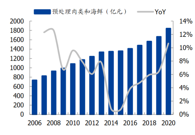图:预处理肉类和海鲜市场规模及增速(来源:中国产业信息网、国盛证券研究所)
