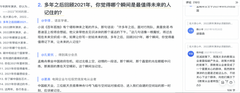 放在过去,这是很难想象的。以“今年跨年演讲必须回答的问题”文档共创里“多年之后回顾2021,你觉得哪个瞬间是最值得未来的人记住的?”为例,出现了32个回答: