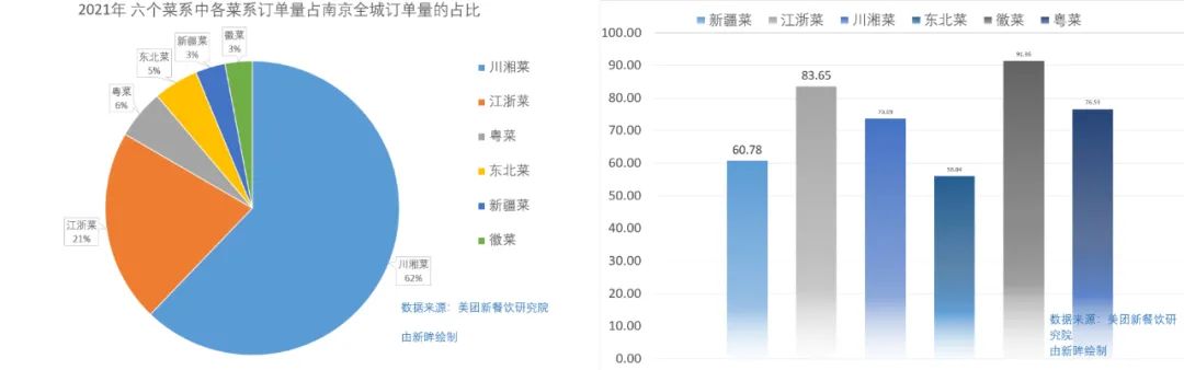 这么来看,南京人似乎更偏爱北方口味,但就六个菜系中各菜系订单量占全城订单量的占比来看,川湘菜和江浙菜依然是多数人的选择,分别占比5.76%、1.96%,而商家增幅比较快的新疆菜和徽菜,和东北菜、粤菜一样,占比不足1%。与此同时,外卖人均客单价方面,六个菜系的差距并不是很大,徽菜以91.36元居于榜首、东北菜以56.04元位于最末,总体水平向上增长。