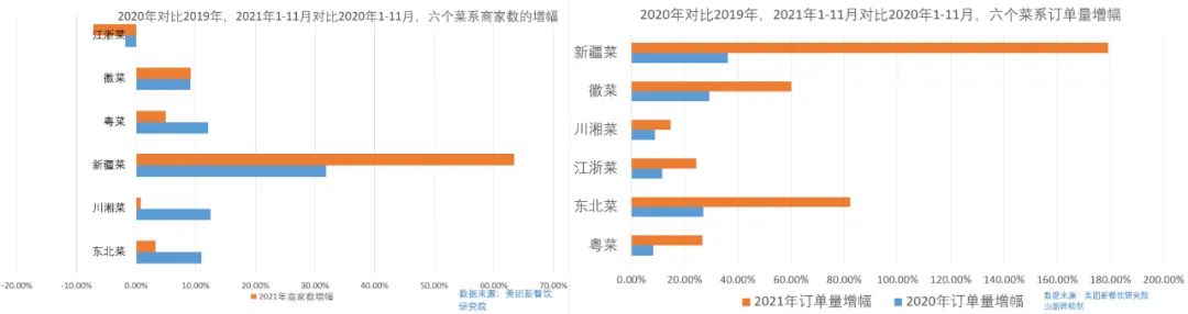 外卖商家方面也有着明显的“异动”。相较于2020年,2021年外卖商家增幅比较明显的是新疆菜,为63.3%,东北菜、川湘菜、粤菜、徽菜均保持个位数增长,江浙菜反而呈现负增长。反应到六个菜系里的订单量,增幅居于前三的是新疆菜、东北菜和徽菜,分别为179.09%、82.21%和60.22%。