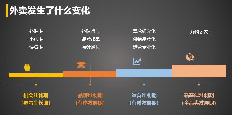 总的来说,外卖产业大致可分为四个阶段,分别是机会红利期(补贴多、小店多、快餐多)、品牌红利期(补贴适当、品牌起量、持续增长)、运营红利期(需求细分化、供给品牌化、运营专业化)以及新基建红利期(全品类发展、万物到家)。