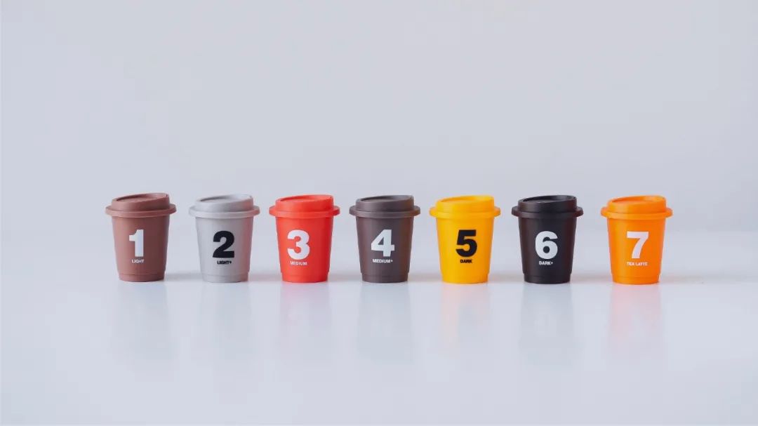不同于传统袋装速溶咖啡,三顿半打造出的是“视觉造型差异化”:高色彩区分度的精致迷你杯装在透明的包装盒里,标注着0—7的数字,由小到大的数值依次对应由浅至深的烘焙度,颜色鲜艳抢眼,不同的颜色和数字的直接对应,将咖啡由酸至苦的口味符号化,让用户更直观地了解产品分类。